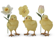 A-Holding Daffodil, B- Holding Pansy, C- Holding Tulip