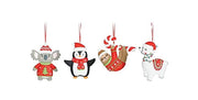 Poly clay character ornament assortment with a red ribbon hanger. The 4 deearing a scarf, and a koala with a sweater. Made of poly clay Sloth: 4 1/2"H X5 1/4"W X 1/2"D. All other animals: 5"H X 4 1/2"W X 1/2"D. Ribbon hanger adds 3" to the overasigns include: a sloth with a red sweater, a llama with lights and a saddle, a penguin wll height.