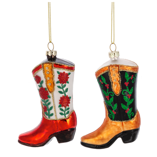 MX197743 Cowboy Boot Ornaments 3" x 4" Red (A) or Black (B) Glass Decor, Christmas Tree, Hang, Western, Country, Farm, Ranch