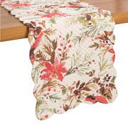The Averie table linen collection adorns any table with the festive red and green of winter cardinals and evergreen pines. This machine washable quilted cotton table runner reverses to a simple holly branch design that is perfect for a Christmas feast!