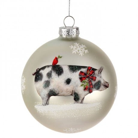 MTC10083 Christmas Pig Ball Ornament 4" Dia Glass Decor, Christmas, Tree, Hang, White, Silver, Farm, Country
