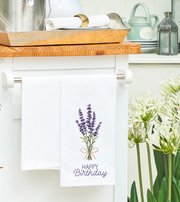 For an elegant kitchen towel with a neutral background, this embellished towel features delicate daisies blooming from the bottom and gracefully extending toward the top. This timeless floral display adds an elegant touch suitable for year-round decor.