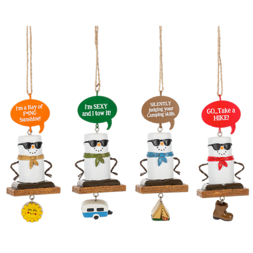 MX200402 S'mores Glamping Ornaments 2" W. x 5 1/4" H. What do you mean no WIFI (A), I don't camp, I glamp (B), My Hiking boot (C), or But first ...