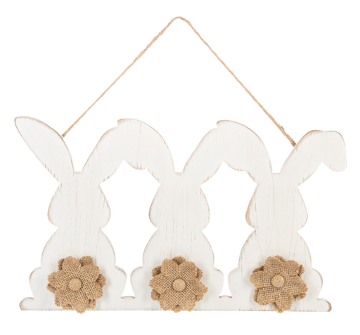 CB187044 Rabbit with Burlap Flower Tail Wall Decor 13" x 2" x 18" Wood Decor, Hang, Spring, Summer, Animal, White, Bunny