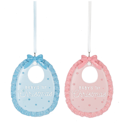 MX196528 Baby Bib Ornaments 2.5" x 3" Blue (A) or Pink (B) Resin Decor, Christmas, Tree, Hang, Family, New Born, 1st, First, Boy, Girl