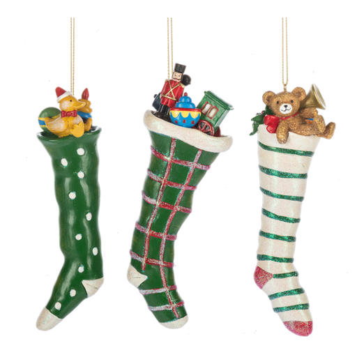 MX199673 Stocking with Toys Ornaments 2" x 5.75" Left (A), Center (B), or Right (C) Resin Decor, Christmas Tree, Hang, Green