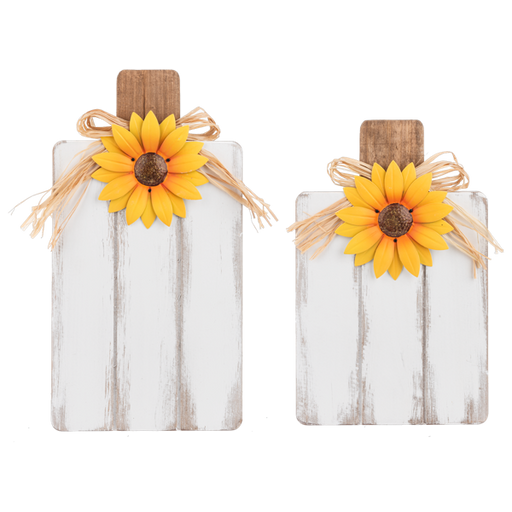 CA196103 Carved Whitewash Pumpkins with Sunflowers Large (A) - 8" x 2.5" x 15" Small (B) - 8" x 2.5" x 12" Wood Decor, Fall, Harvest, Autumn, Thank...