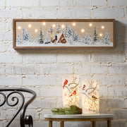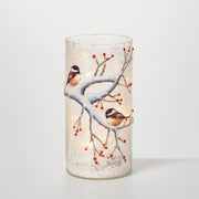 Frosted with faux snow and hand-painted with a breathtaking scene of chickadees resting on a branch, this cylinder is magnificent as a stand-alone design piece. Decorative and dynamic, this unique 8" tall piece also lights up, making it a seasonal show-stopper!